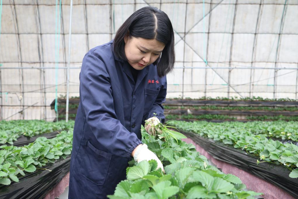 在辽宁东港市椅圈镇德祥村,返乡大学生张晓林正在大棚内查看草莓长势。(受访者供图)