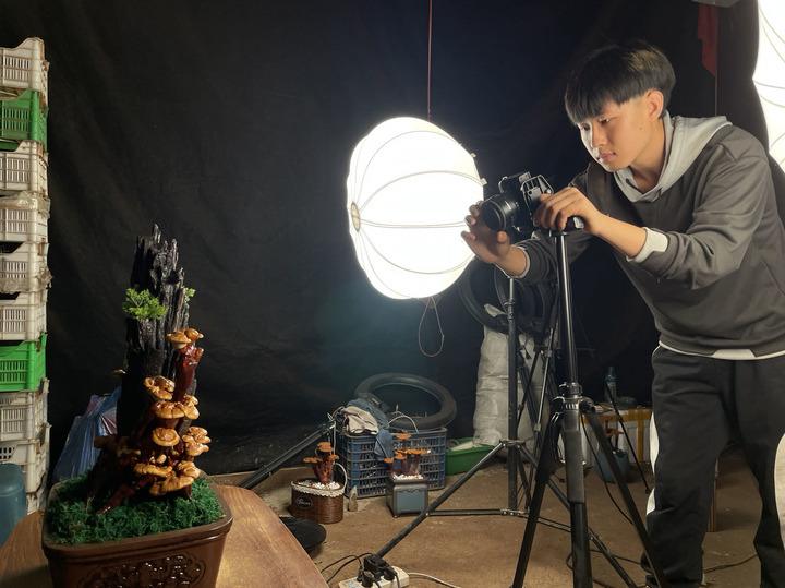 在营口市老边区柳树镇东柳村,返乡大学生任嘉辉通过直播售卖灵芝。新华社记者武江民摄
