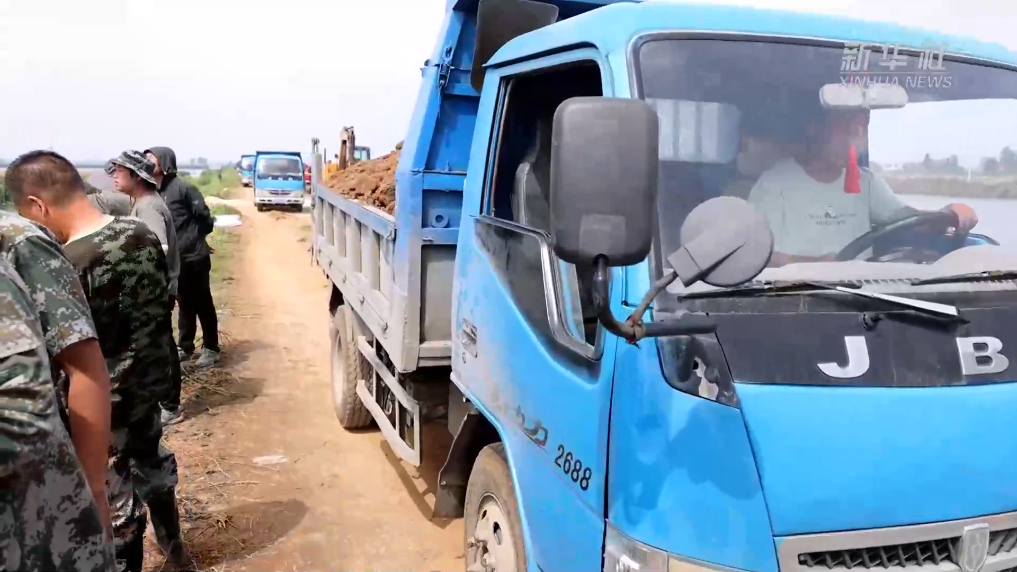 记者在现场看到,一辆辆卡车将黏土倾倒在封堵后的河堤上,随后由挖掘机将其推平,进行加高加固、防渗闭气作业。