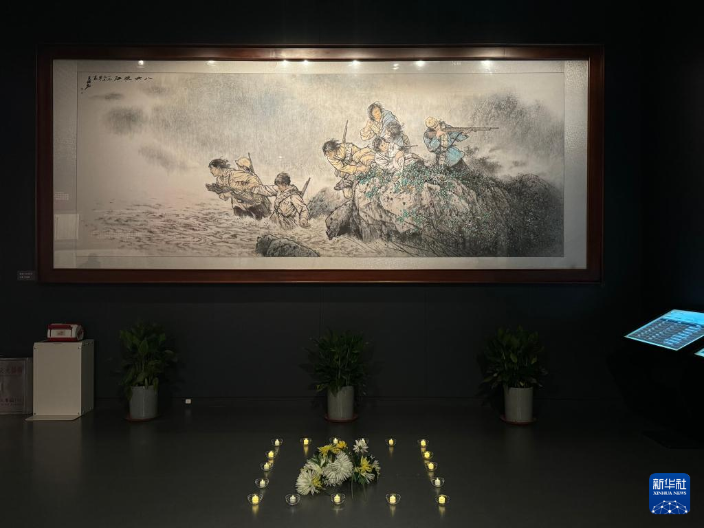 9月3日,沈阳“九·一八”历史博物馆展厅内“八女投江”展区前观众敬献的菊花。新华社记者 陈雨峥 摄