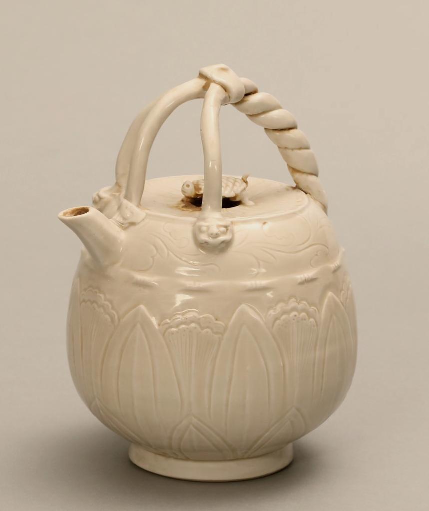 展出的宋定窑白釉刻花三叉提梁壶。沈阳故宫博物院供图