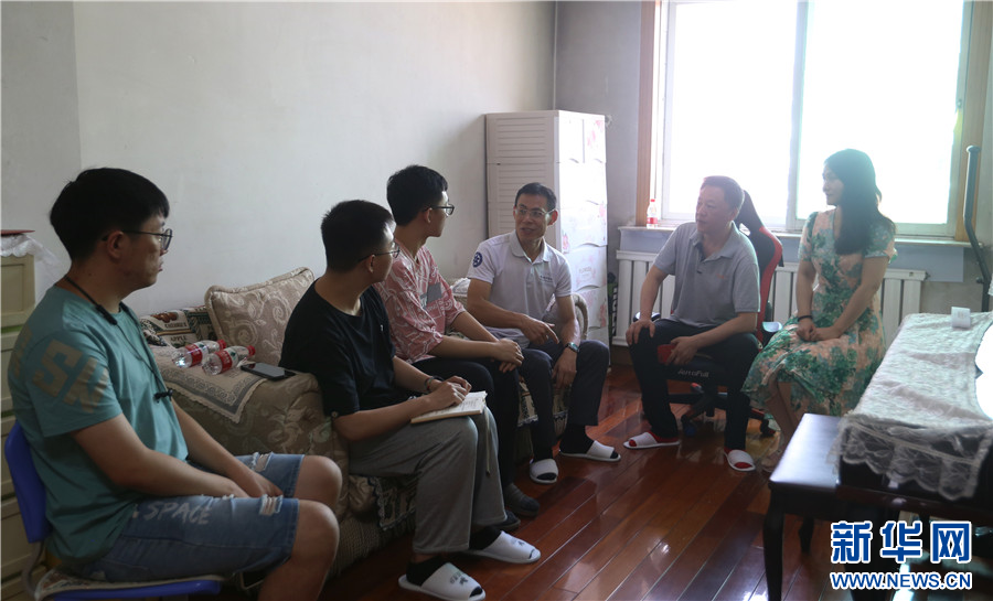 图为国科大本科辽宁招生组老师、生命科学学院教授崔骁勇(右三)来到王鹤鸣家中进行“家访”。新华网刘舒摄
