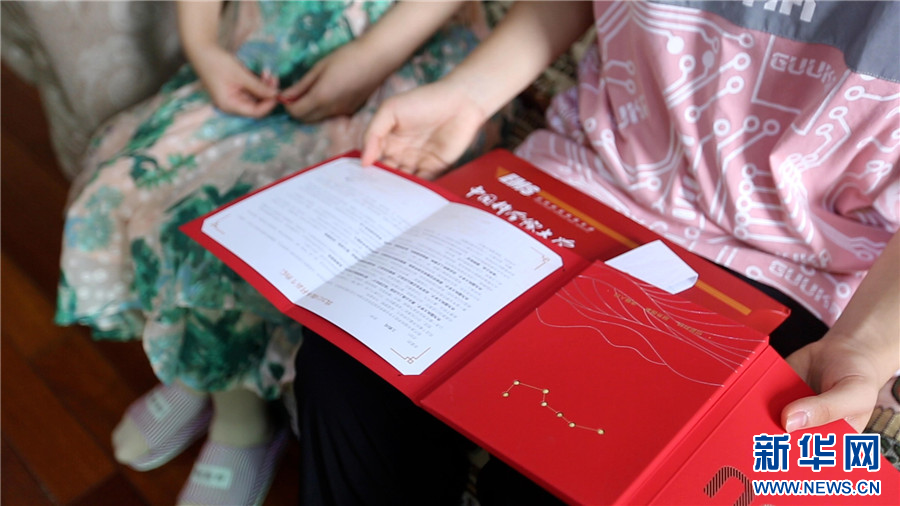 图为一家三口拆开国科大录取通知书。新华网刘舒摄
