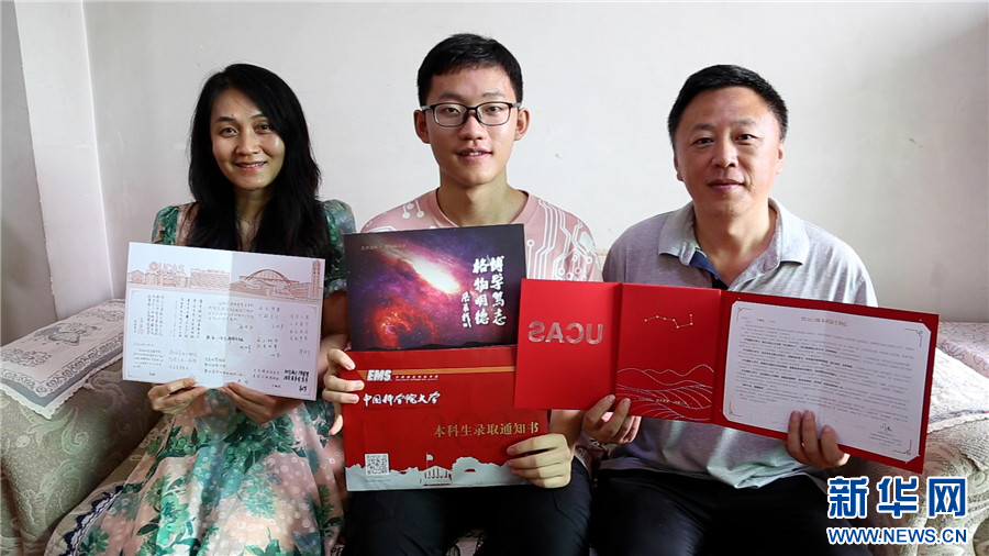 图为一家三口展示国科大录取通知书。新华网刘舒摄