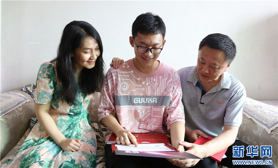 图为王晓宏将录取通知书送到儿子手中。新华网发