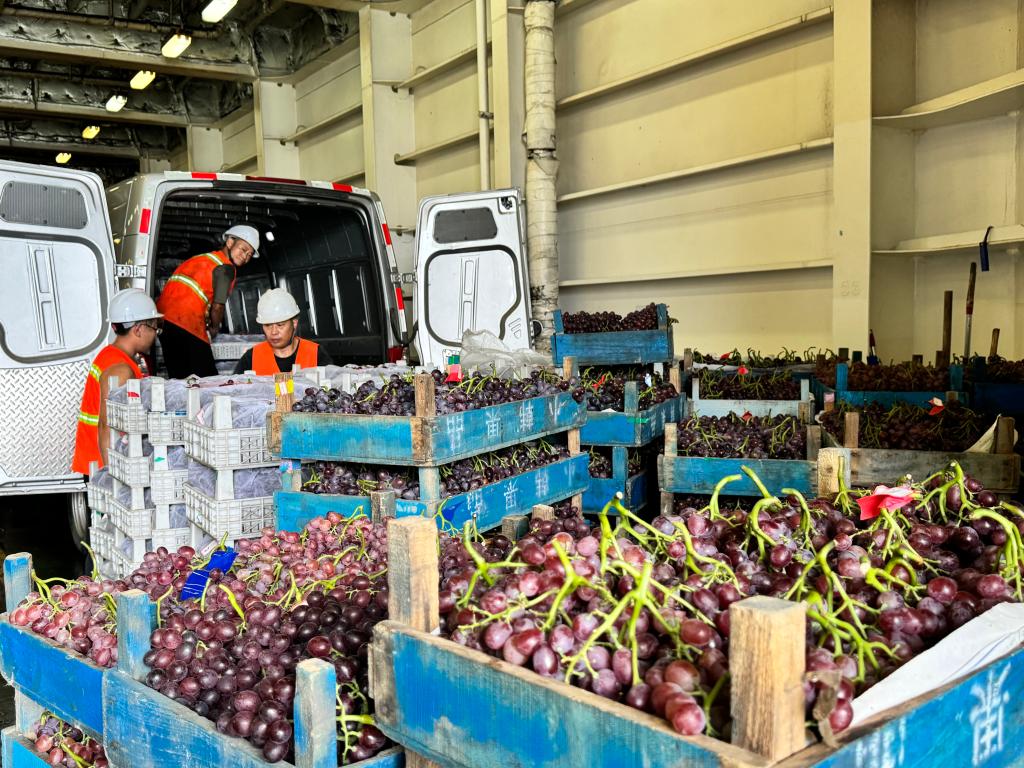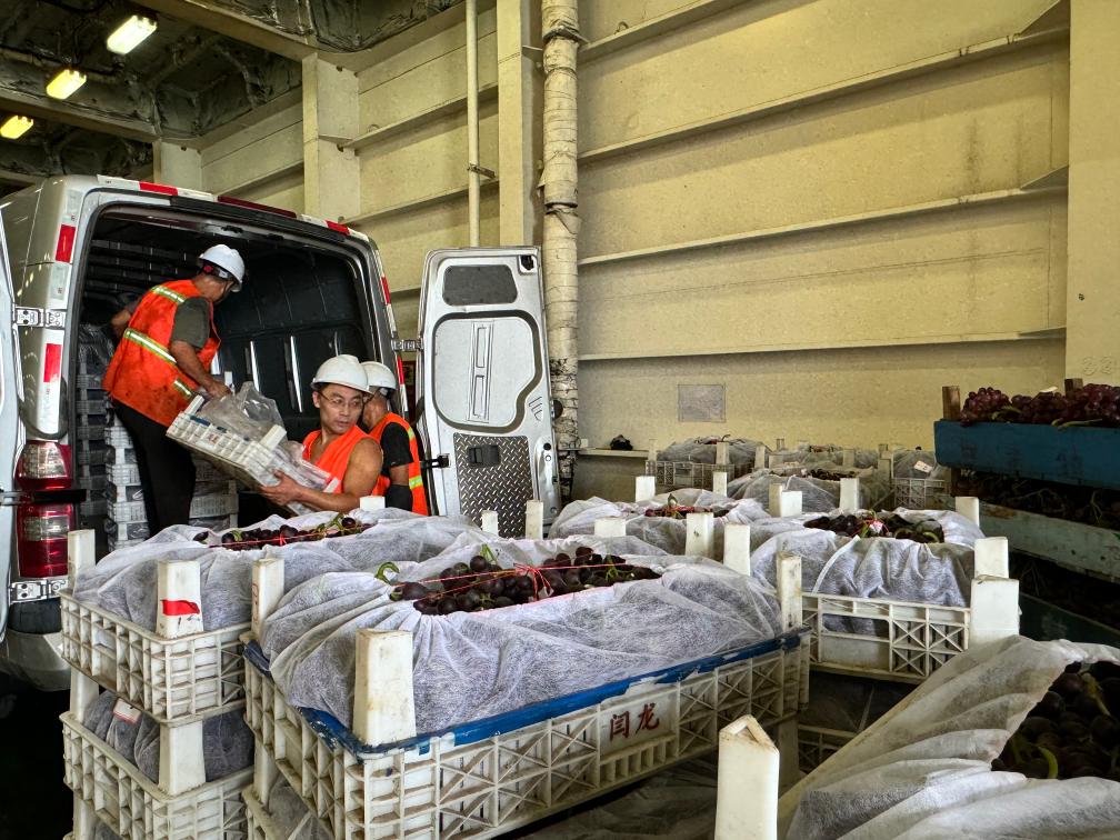 新华网沈阳9月12日电(刘嘉、戴少毅)12日中午,中铁渤海3号渡船汽车舱内,工作人员小心翼翼地将上万斤葡萄从货车车厢搬运至渡船散货区。烟台市地处胶东半岛,暖温带季风气候赋予其葡萄种植得天独厚的地理、气候和土壤优势,蓬莱作为烟台市葡萄种植重要区域,产出的葡萄果肉饱满、色泽艳丽。