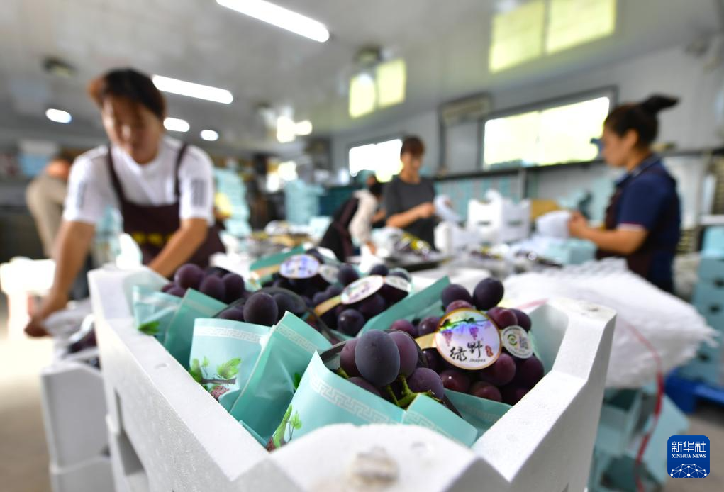 9月11日,在灯塔市古城街道康家台村,葡萄种植户在给葡萄打包装箱。新华社记者杨青摄pagebreak