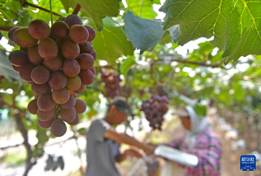 9月7日,在灯塔市柳条寨镇辽峰葡萄核心产区,种植户在大棚采摘葡萄。新华社记者杨青摄