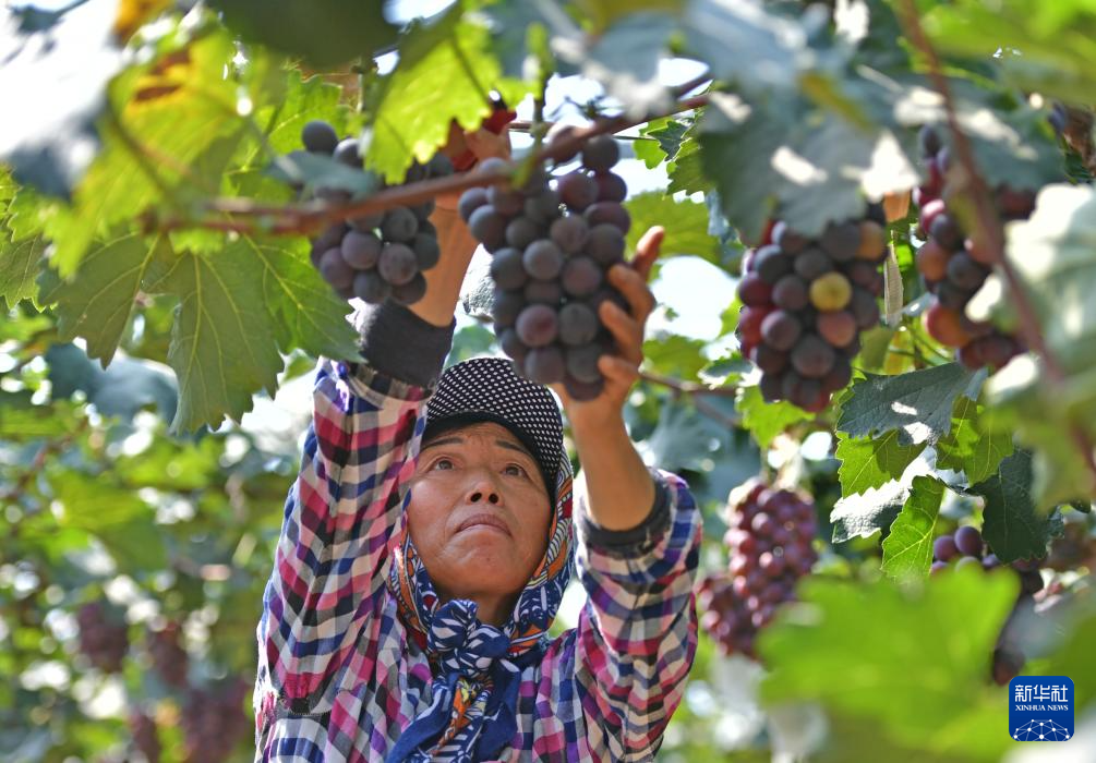 9月11日,在灯塔市古城街道康家台村,葡萄种植户在采摘辽峰葡萄。新华社记者杨青摄pagebreak