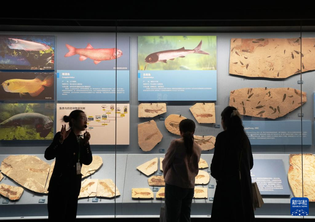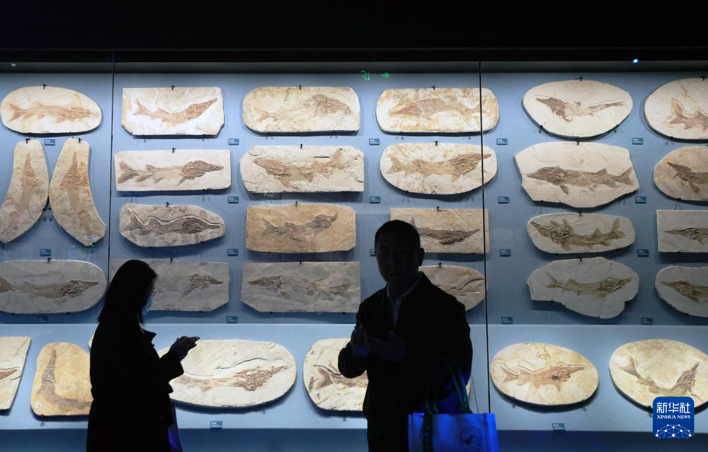 4月27日,游客在辽宁朝阳古生物化石博物馆内参观。