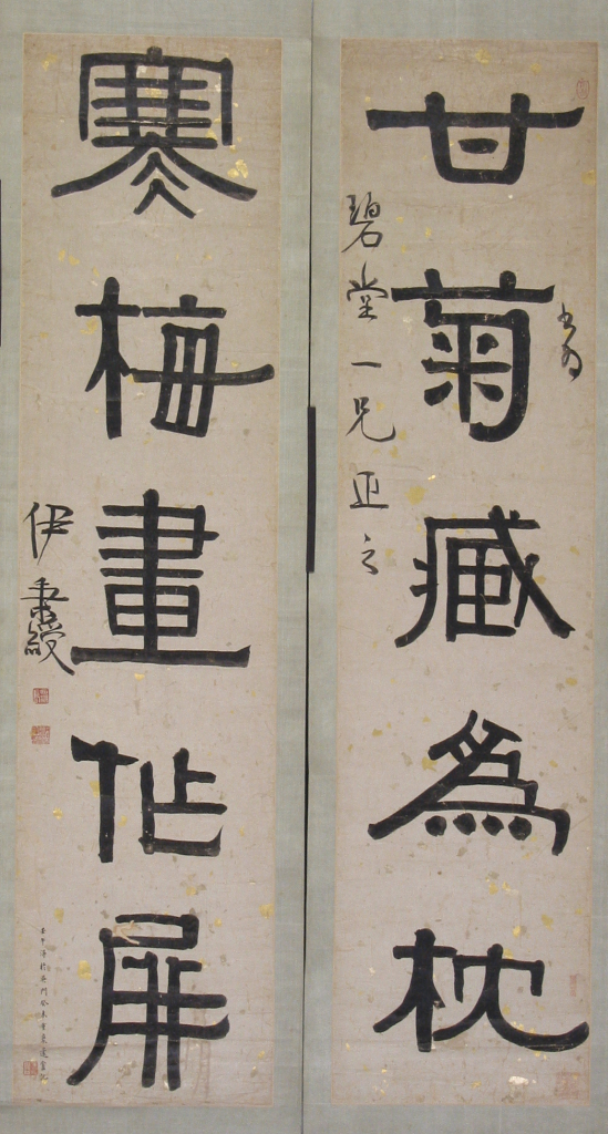 伊秉绶为篆隶中兴先驱代表,此次展出其隶书五言联“甘菊藏为枕,寒梅画作屏”引人注目。王喆介绍,伊秉绶的隶书风格是在广泛吸取汉代砖瓦铭文、隶书碑刻等基础上形成的,在准确把握汉碑敦厚古朴艺术特点的同时,加入了个人理解,形成了“融颜入隶”的独特风格,舒缓平淡又不失大气雍容。(记者赵洪南)