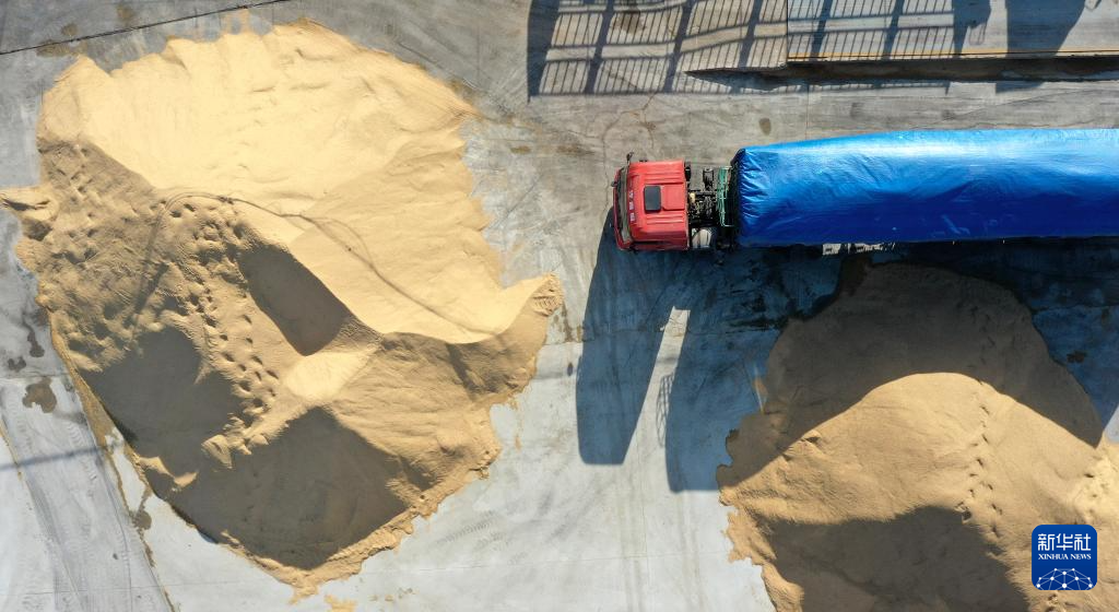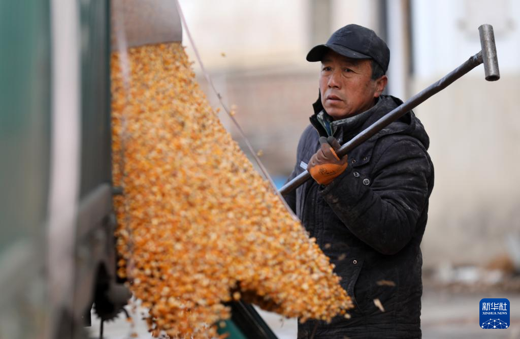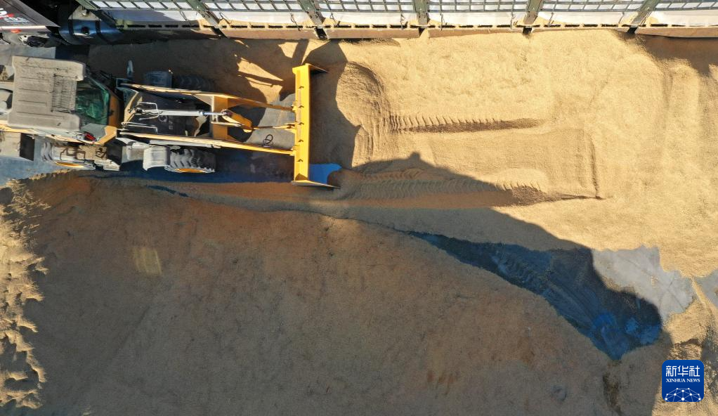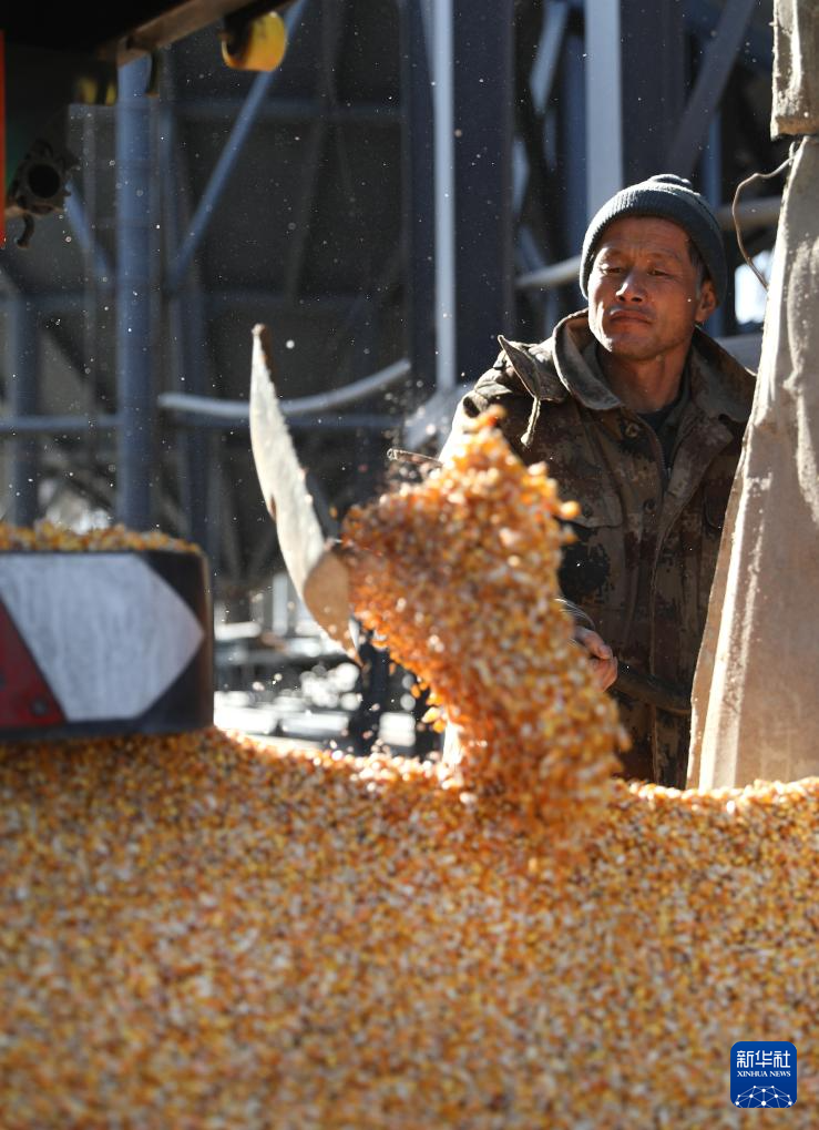 11月16日,工人在辽宁省台安县鞍山满丰粮食贸易有限公司粮库内卸载玉米。新华社记者 姚剑锋 摄