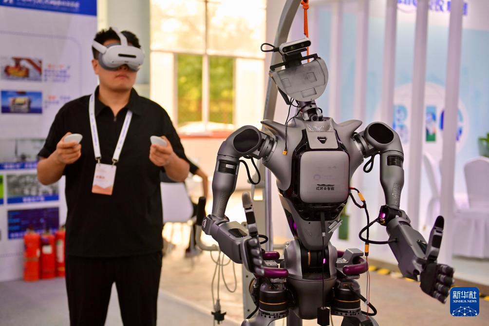 9月5日,在沈阳的2025全球工业互联网大会的展览区现场,中国科学院沈阳自动化研究所的机器人工程师在调试具身智能操作系统。