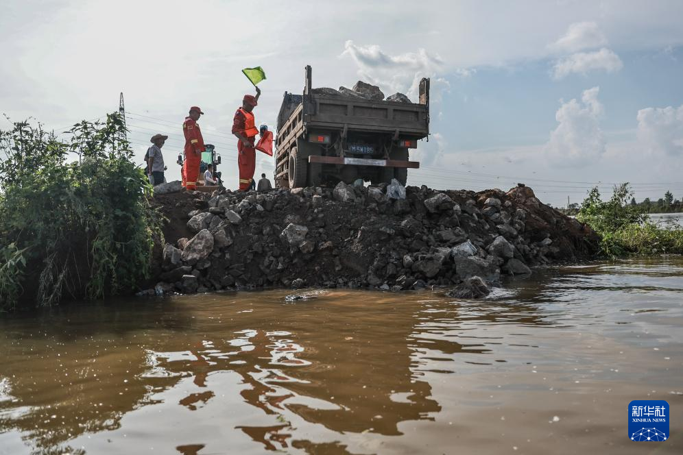 8月6日,抢险人员在王河溃口处进行封堵工作。新华社记者潘昱龙 摄