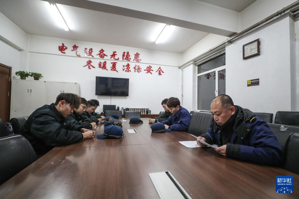 2月4日,开工前,田鹤(右一)与同事进行交班会,安排当天工作。新华社记者 潘昱龙 摄pagebreak