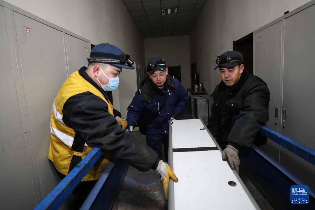 2月4日,田鹤(中)与同事将更换使用的配件搬上电瓶车,运往整备库,供当晚使用。新华社记者 潘昱龙 摄