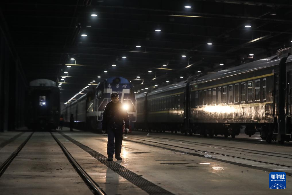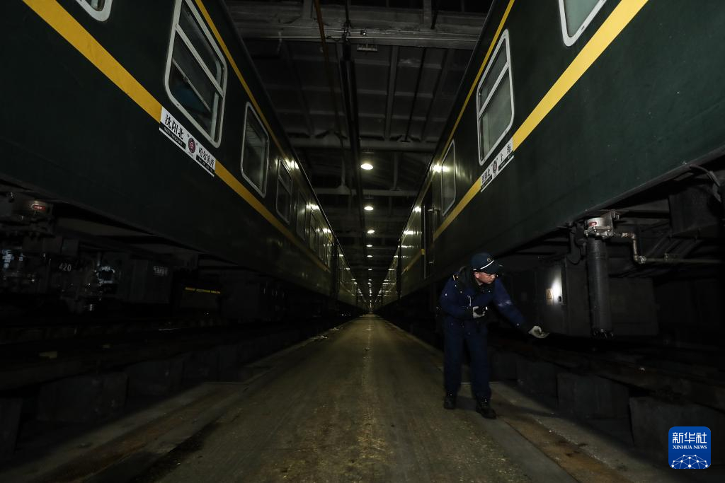 2月4日,田鹤在沈阳车辆段沈阳北整备库内,准备对一列普速列车进行检修工作。新华社记者 潘昱龙 摄