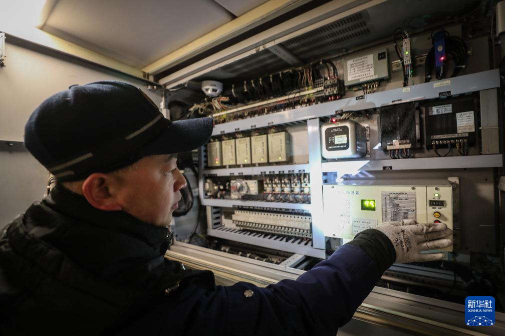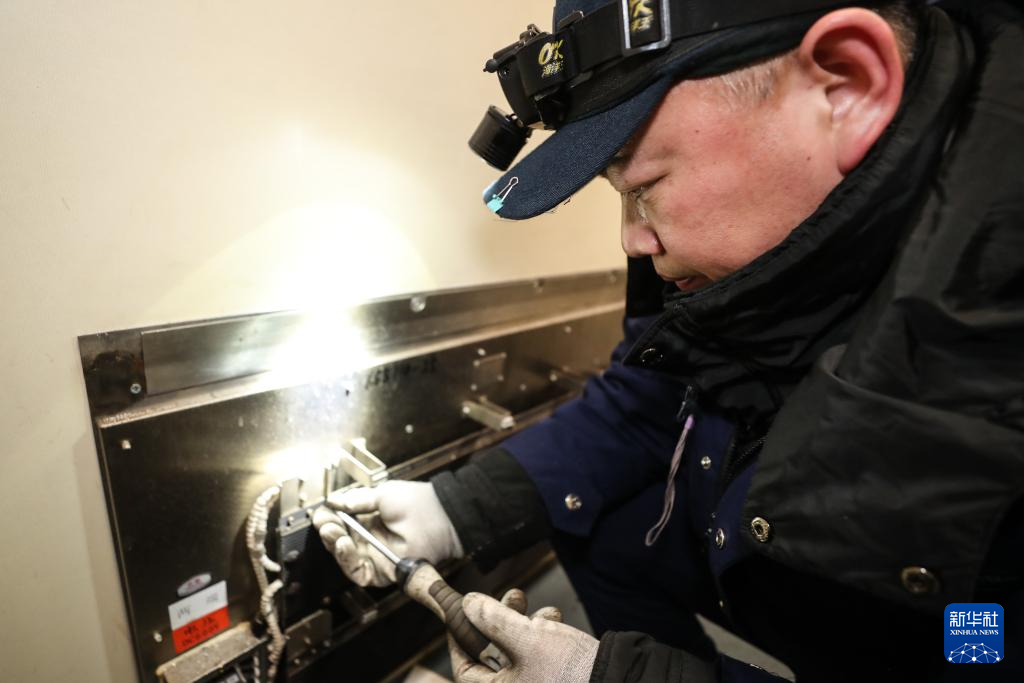 2月5日,田鹤对一列普速列车内的电暖器进行维修。新华社记者 潘昱龙 摄pagebreak