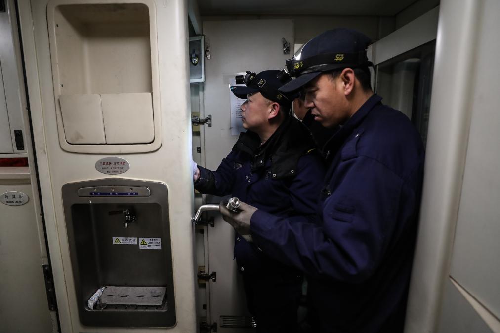2月5日,田鹤(左)与同事在维修一列普速列车上的电开水炉。新华社记者 潘昱龙 摄pagebreak
