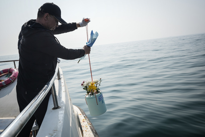 鸣笛声再次响起,家属们将骨灰缓缓倒入莲花形状的可降解骨灰罐里,投放到海水中。随着骨灰罐在海面由大变小,逐渐沉入海底,甲板上的哭声再也止不住。海风呜咽,数十只海鸥随船盘旋,后又向大海深处飞去。