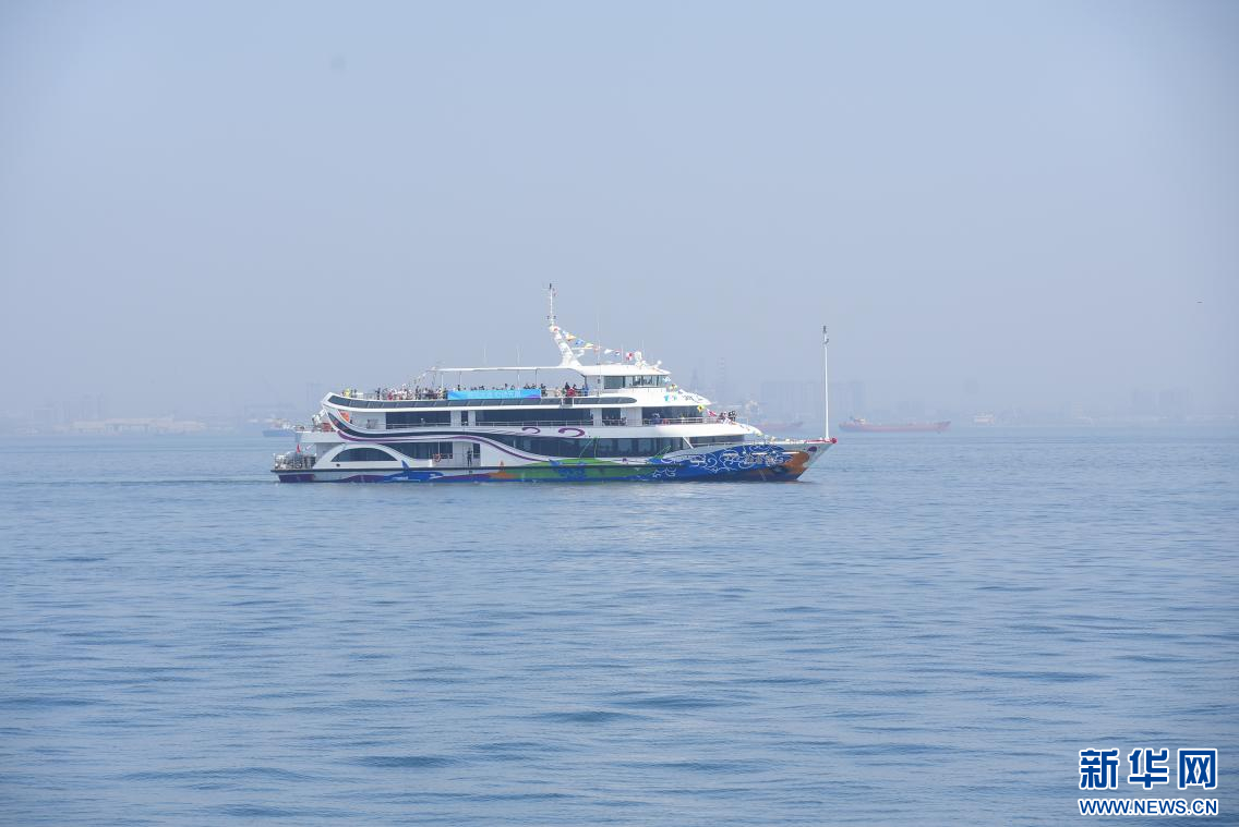 市民游客在东方水城欣赏海上游轮。新华网许志康摄