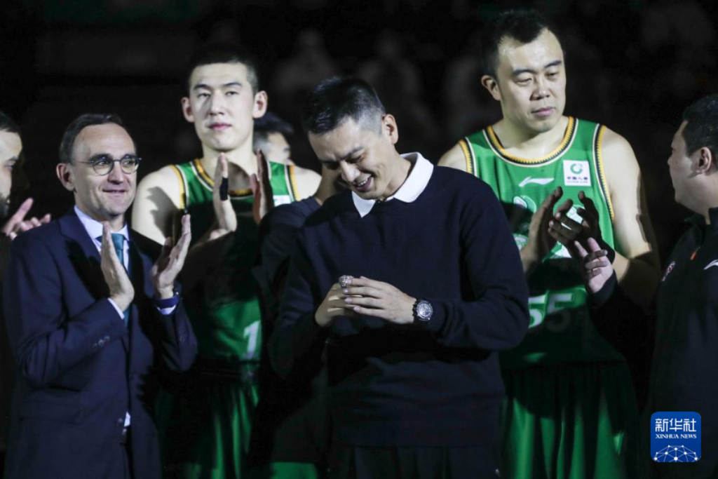 11月15日,在赛前领取冠军戒指仪式中,前辽宁本钢队主教练杨鸣(前右二)与现任辽宁本钢队主教练乌戈(前左二)交流。新华社记者 潘昱龙 摄pagebreak