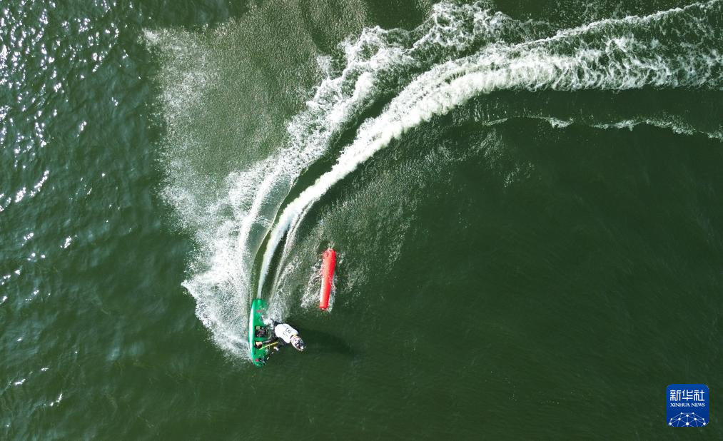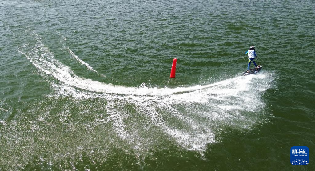9月16日,金华市芒果体育队选手冯章豪在专业组公开级:男子动力冲浪板环圈竞速赛中(无人机照片)。新华社记者 陈为 摄