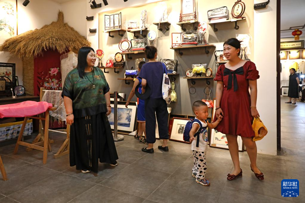 7月5日,王立君(左)在位于辽宁省营口市辽河老街上的工作室里为前来参观的游客介绍满绣创作。新华社记者 姚剑锋 摄