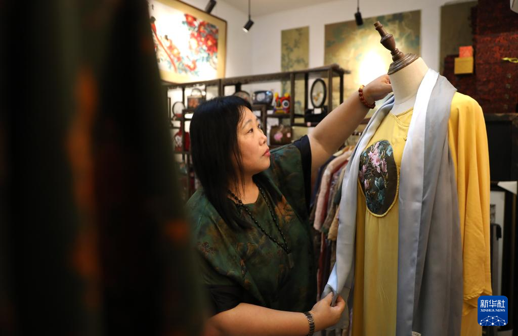 7月5日,王立君在位于辽宁省营口市辽河老街上的工作室里为她设计的带有满绣图案的民族服饰进行搭配。新华社记者 姚剑锋 摄pagebreak