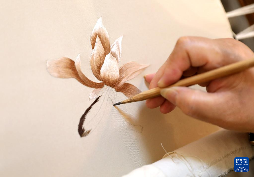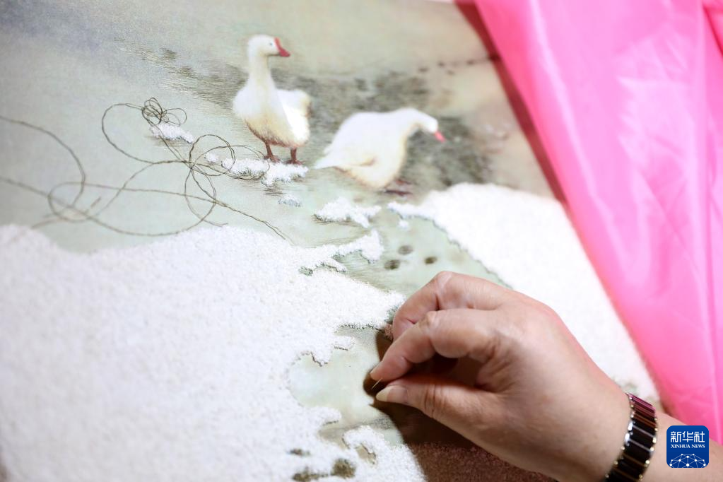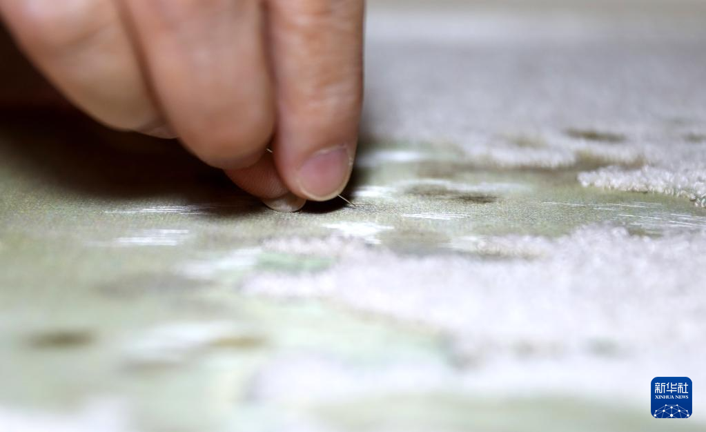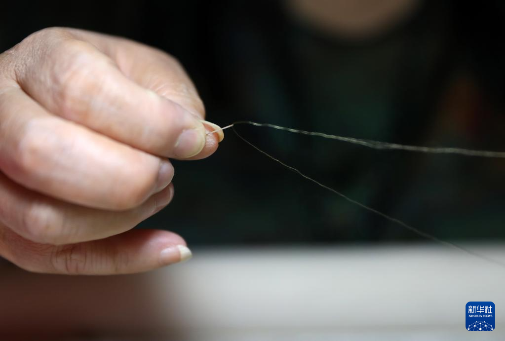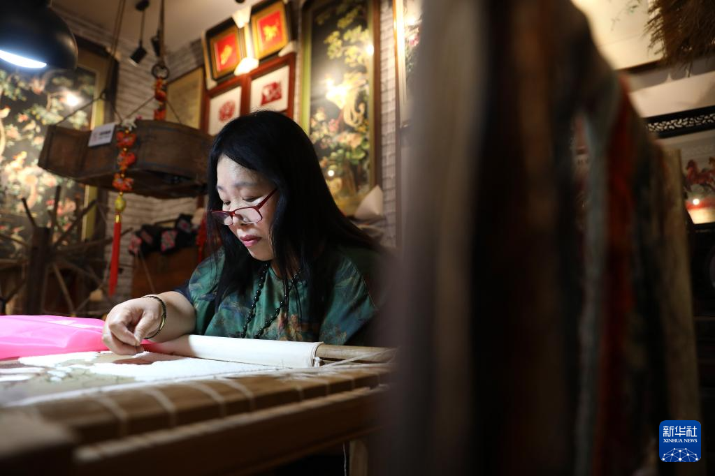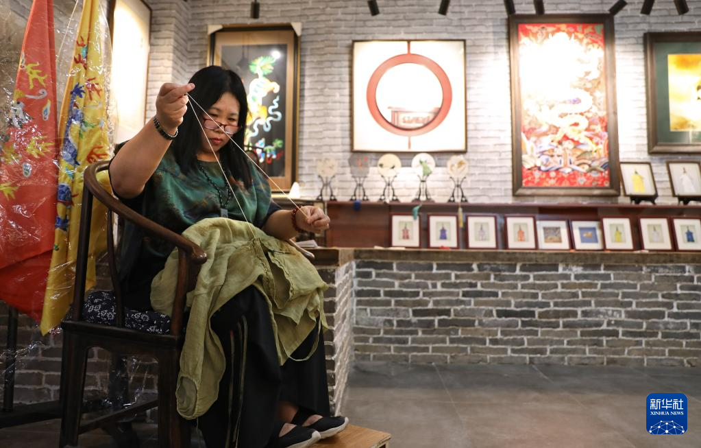 7月5日,王立君在位于辽宁省营口市辽河老街上的工作室里进行满绣创作。新华社记者 姚剑锋 摄
