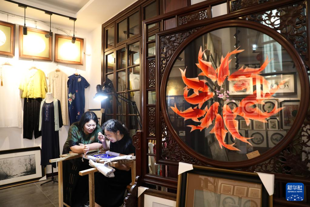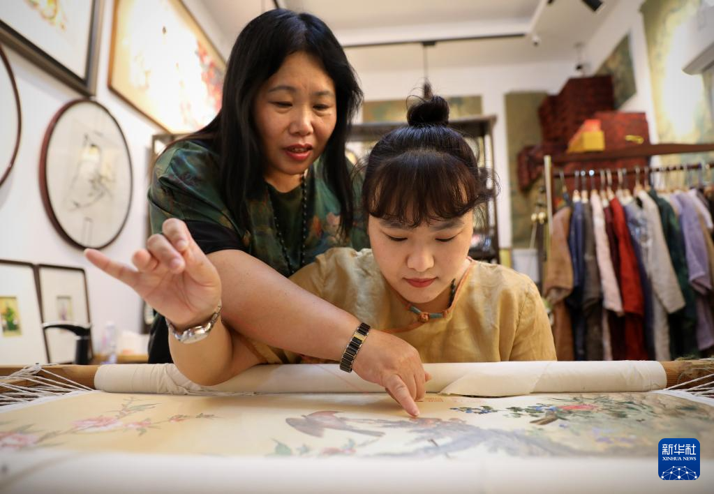 7月5日,王立君(左)在位于辽宁省营口市辽河老街上的工作室里给徒弟指导满绣创作技艺。新华社记者 姚剑锋 摄pagebreak