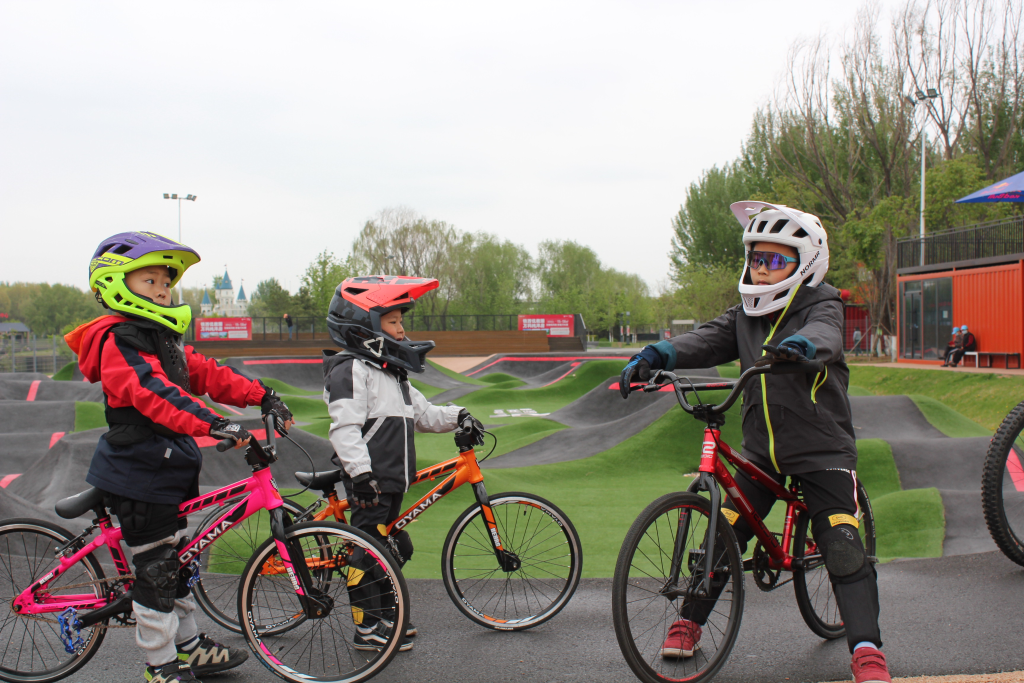 培训现场旁的“波浪道”上,11岁的女孩张依然压低车身过弯,利用坡道弹力轻盈跃起。练习小轮车一年半的她说:“‘波浪道’让我身体健康,我很热爱这项运动。”