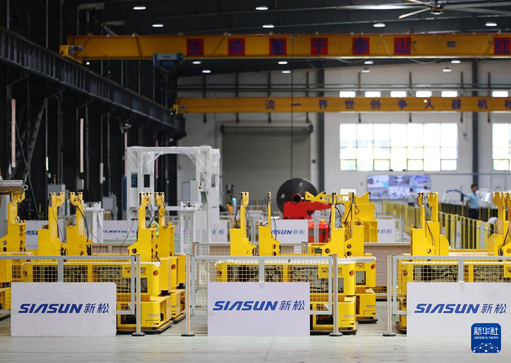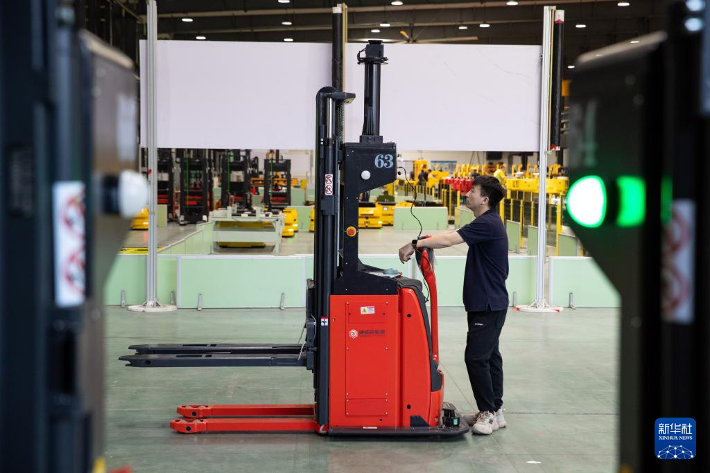 这是6月12日在辽宁省沈阳新松机器人自动化股份有限公司拍摄的叉式移动机器人。新华社记者 李旭伦 摄pagebreak