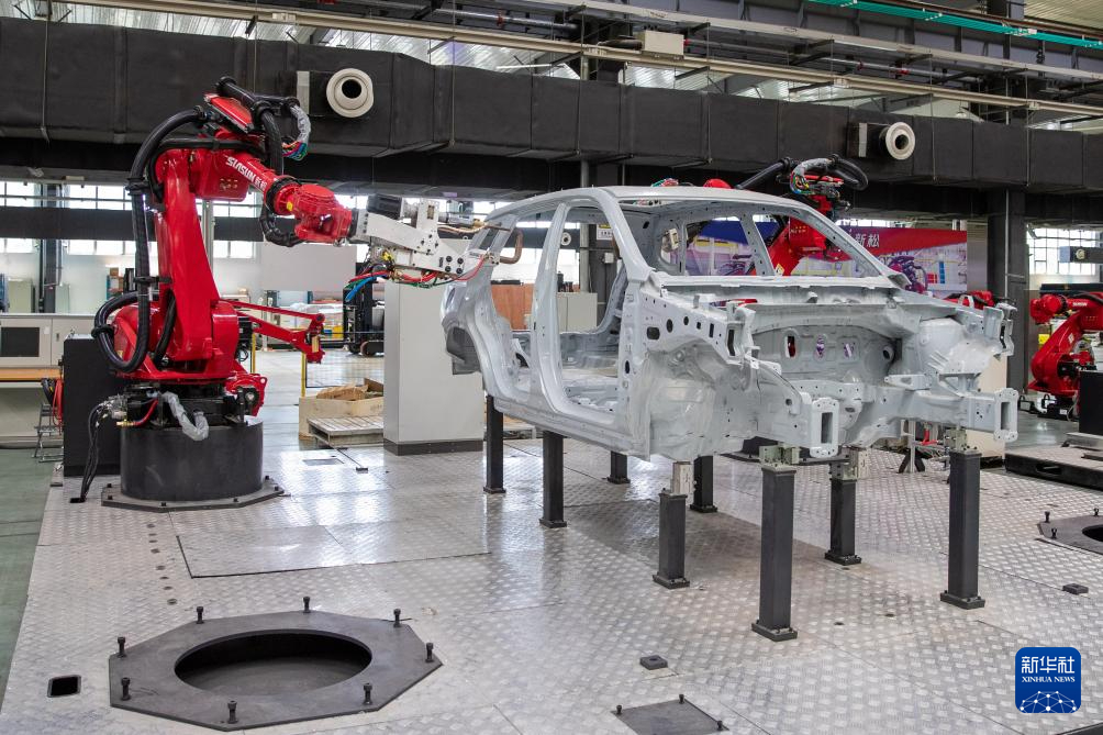 这是6月12日在辽宁省沈阳新松机器人自动化股份有限公司拍摄的白车身点焊机器人。新华社记者 李旭伦 摄pagebreak