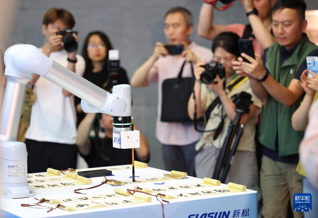 6月12日,媒体记者在沈阳新松机器人自动化股份有限公司拍摄正在进行书法创作的智能机器人。新华社记者 李钢 摄pagebreak