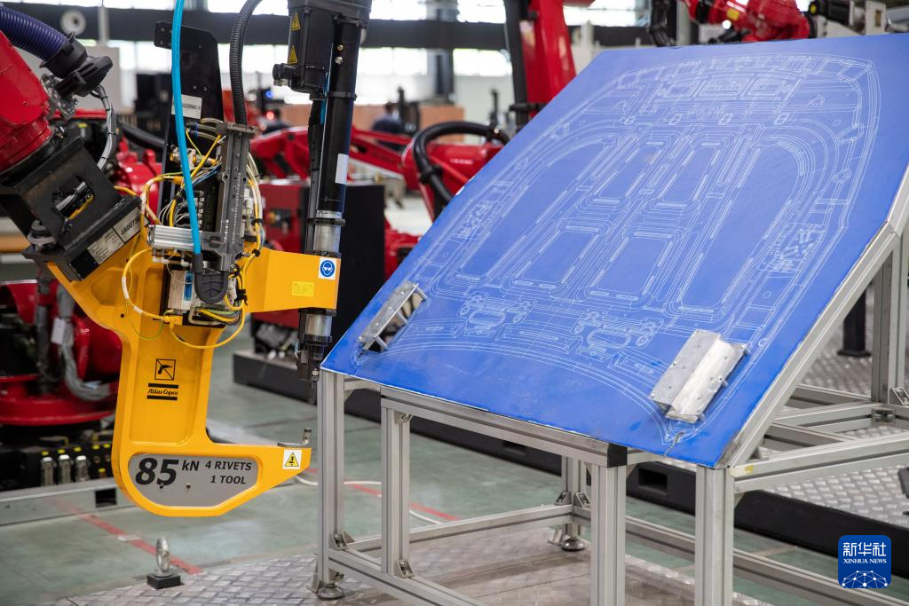 这是6月12日在辽宁省沈阳新松机器人自动化股份有限公司拍摄的铆接机器人。新华社记者 李旭伦 摄pagebreak