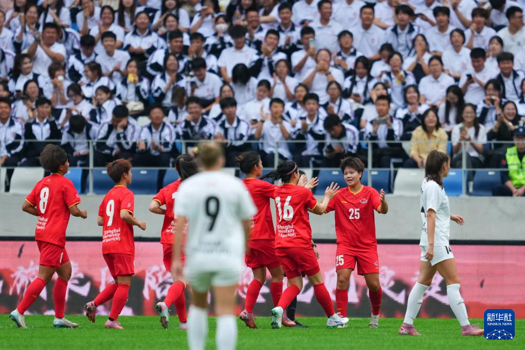9月27日,上海体育大学女足球员尹丽红(右二)进球后与队友庆祝。新华社记者 郑焕松 摄