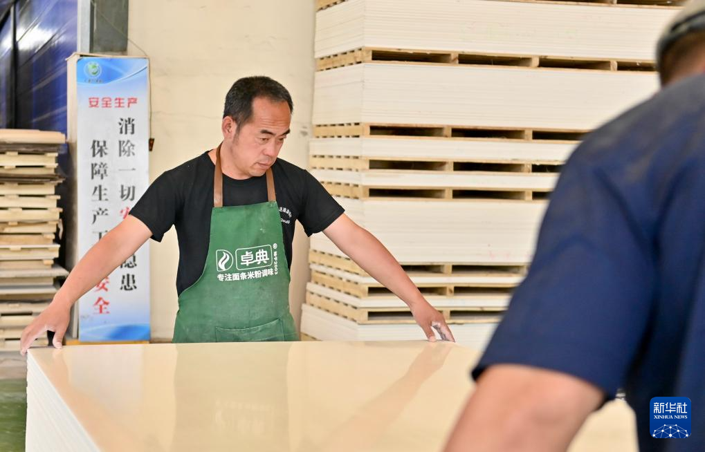 6月6日,工人在海城市大德广消防门业材料有限公司搬运菱镁防火门芯板。