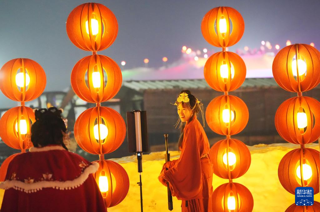 1月12日,在沈阳市沈北新区的稻梦小镇,游客打卡拍照。