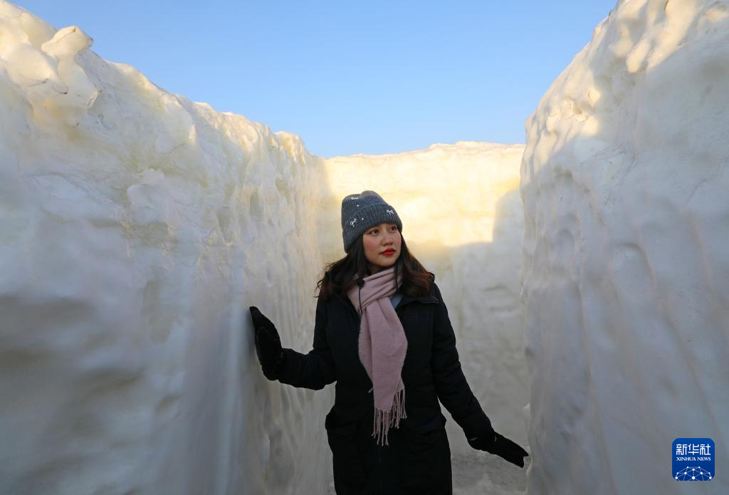 1月12日,在沈阳市沈北新区的稻梦小镇,游客探访雪地迷宫。