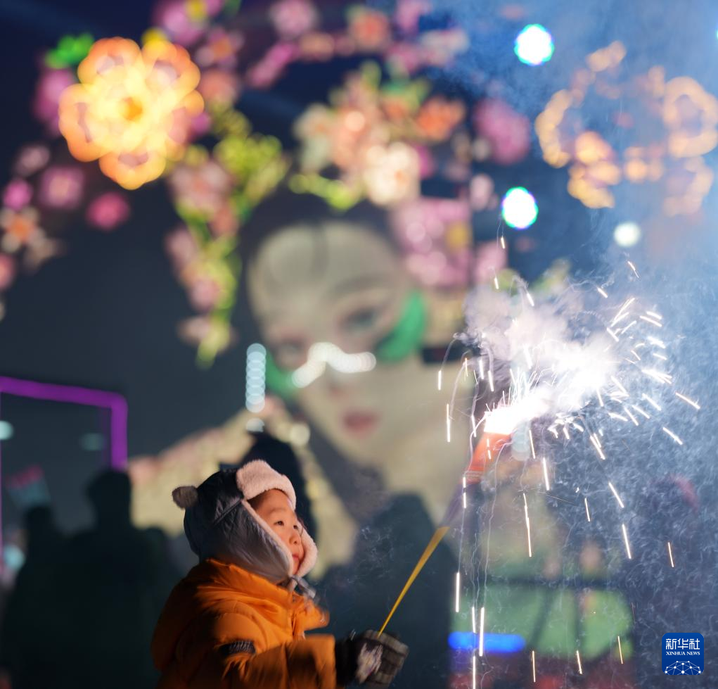 1月12日,在沈阳市沈北新区的稻梦小镇,小游客放烟花。