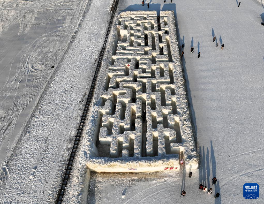 1月12日,在沈阳市沈北新区的稻梦小镇,游客打卡雪地迷宫(无人机照片)。
