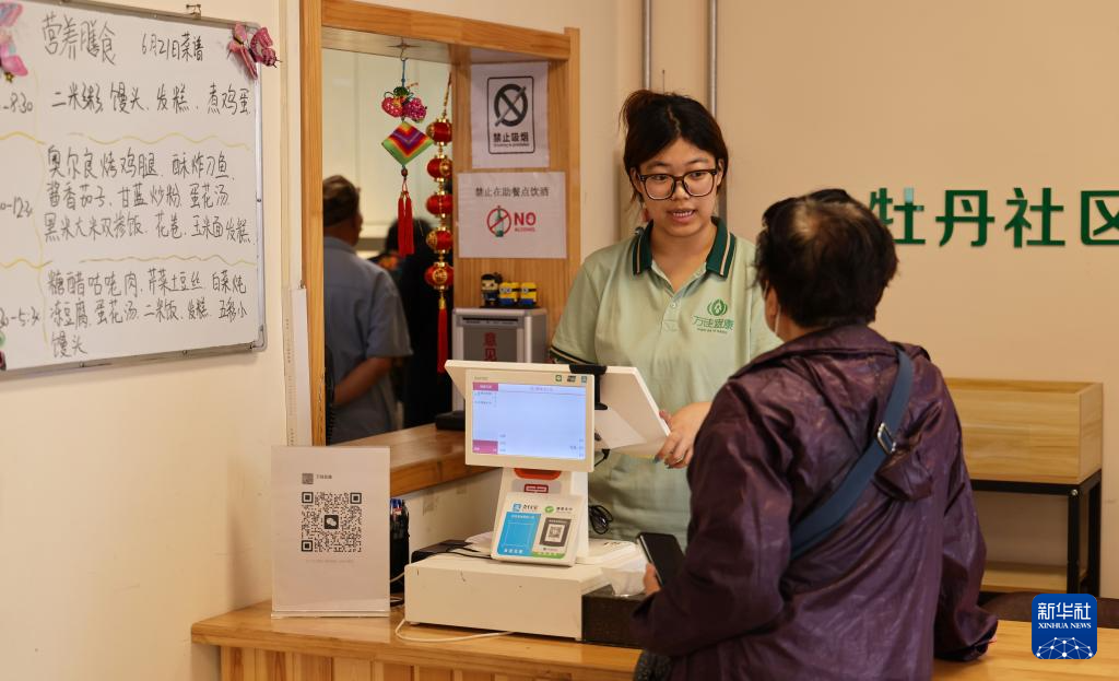 6月21日,在沈阳市皇姑区牡丹社区的助餐点,工作人员为老人点餐。新华社记者 李钢 摄