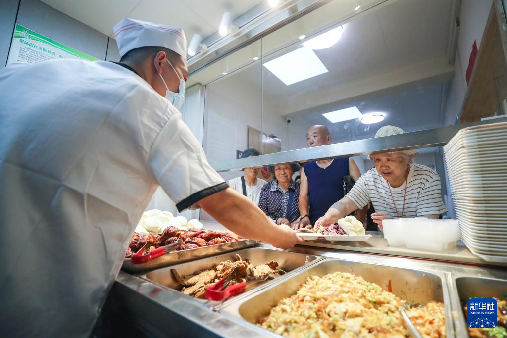 6月21日,在沈阳市牡丹社区党群服务中心,工作人员为前来用餐的老人打饭。新华社记者 龙雷 摄