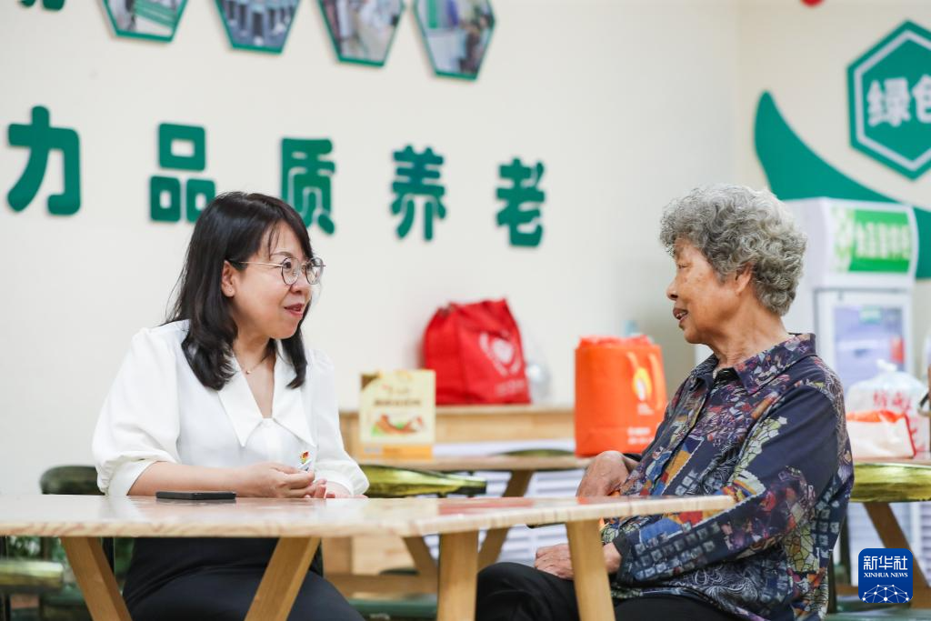 6月21日,沈阳市牡丹社区党委书记王晖(左)与社区老人交流。新华社记者 龙雷 摄