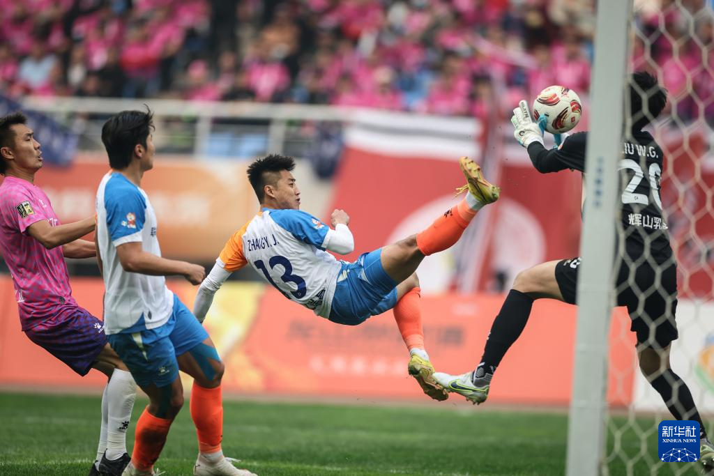 4月20日,江西庐山队球员张延军(右二)在比赛中射门。新华社记者 潘昱龙 摄