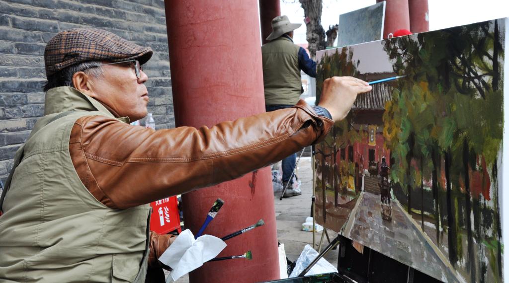 尽管细雨连绵,不少油画家还是把作画地点选在了户外。屋檐下,中国美术家协会国家重大题材美术创作艺委会委员、清华大学美术学院教授王铁牛遥望大雄殿,在料峭春寒中绘制了这座北方古刹难得的雨景。这位年逾古稀的油画大师对记者回忆起了他多次到访景区的经历,并对义县当地将奉国寺“修旧如旧”的文物保护工作表达了称赞。