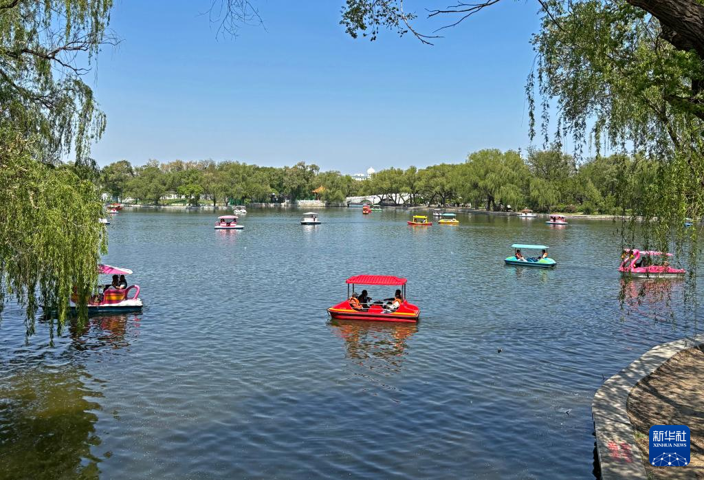 5月11日,市民在沈阳市北陵公园划船。