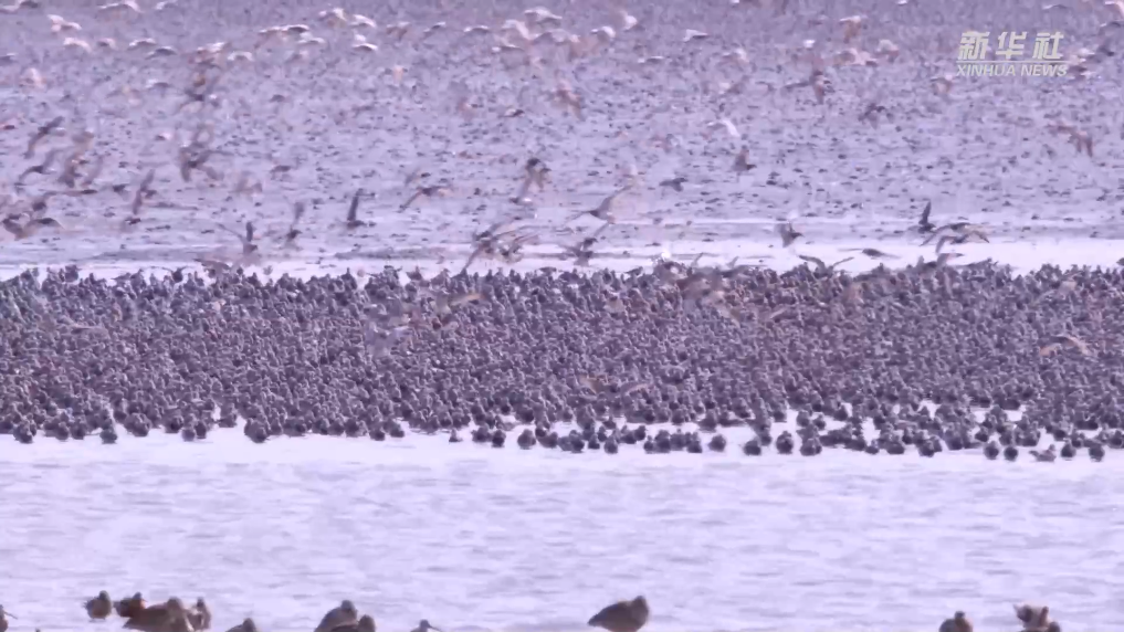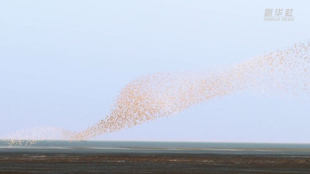 金秋时节,辽宁丹东鸭绿江口候鸟栖息地,栖居在这里的候鸟随奔涌潮水起起落落,形成壮观“鸟浪”。
