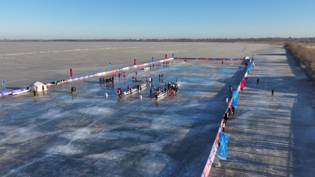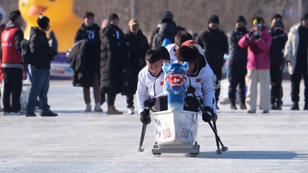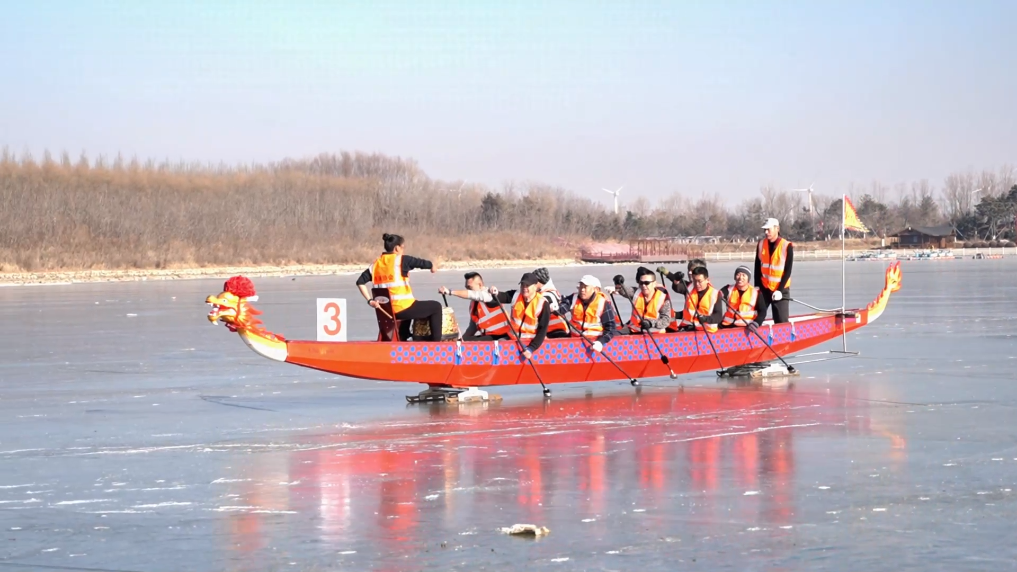 跃上龙舟、保持平衡、双桨撑地、滑行出发……近日,在辽宁省康平县卧龙湖的冰面上,来自全国各地的冰上龙舟参赛队员,享受着中国北方独有的冰上龙舟带来的快乐。